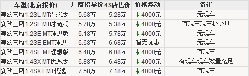 雪佛兰赛欧是一款性价比很高的车空间大,外形时尚很适合家用。近日根据网上车市价格监测系统显示,目前北京地区购买雪佛兰赛欧,可以得到4000元的优惠以及价值1千元的装饰礼包,具体售价参见下表: