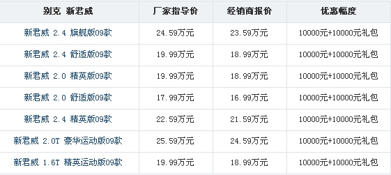 近日,编辑从广州地区通用别克经销商了解到,目前购买通用别克新君威拥有10000元现金优惠,再送万元大礼包,感兴趣的朋友可致电或到店详询,具体优惠情况如下表: