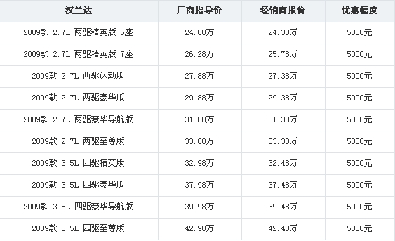 近日,编辑从广汽丰田4S了解到,购买汉兰达全系优惠5000元。详情请致电经销商咨询,具体价格详情如下: