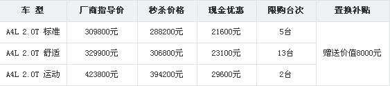近日,编辑从北京地区某一汽奥迪4S店了解到,自7月25日至7月31日,该经销商推出奥迪A4L多款车型限量秒杀行动。参加此活动可享奥迪A4L最高2.96万元的现金优惠,置换购车还可获赠价值8000元的车辆保险。限购现车总计20台,活动期间不接受预订。有兴趣可咨询经销商,详情见下表: