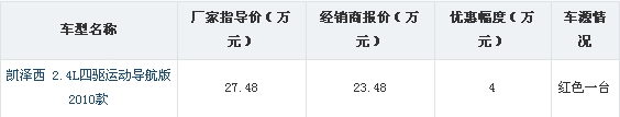 价格波动情况:凯泽西在沈阳地区价格比较稳定,2011年到至今鲜有优惠。目前店内推出展厅展示一台红色特价车,优惠幅度达到4万元。