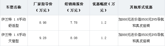 近日,编辑从北京现代品牌沈阳地区经销商处了解到,目前购买2011款伊兰特1.6车型可享受1.2万元的现金优惠,加888元送价值8500元DVD导航和真皮座椅,店内有现车,有兴趣的朋友不妨到店咨询。