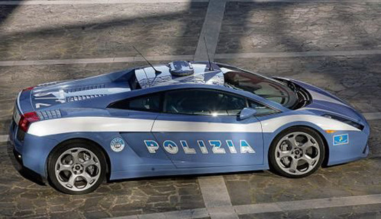 兰博基尼Gallardo警车是在意大利警察建立152周年纪念日捐赠给警察部队的。官方称这种兰白相间的超级跑车将在紧急运送人体器官的工作中大显身手,这款车前行李箱是一个冷藏室,可以用来保存器官。实际上,这辆Gallardo警车的大部分时间都是在靠近罗马市区南部的意大利警察局汽车博物馆的门前巡游,向人们展示意大利警察有一辆非常酷的兰博基尼警车。