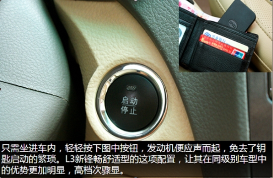 虽然是手动舒适型,但keyless这样的高端配置仍可觅得踪迹,不仅实用方便,更能突显L3新锋畅舒适型的高档次。