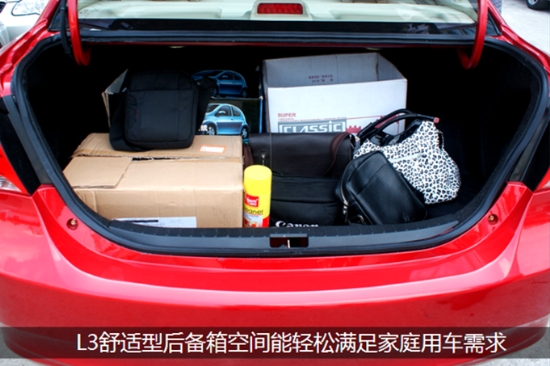 为了追求尾翼造型,L3后备箱开口较大,方便大件物品取放,但宽大的储物空间还是能满足大多数家庭用车需要。