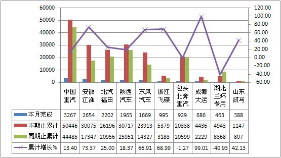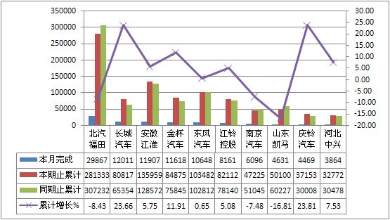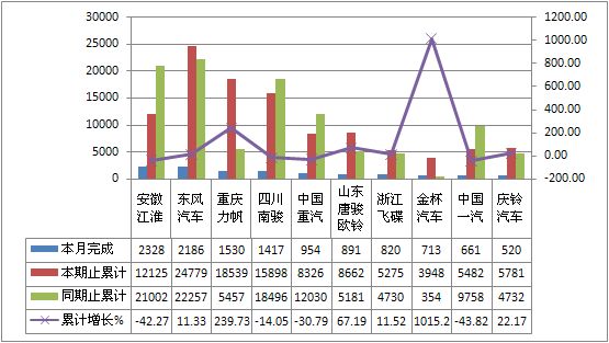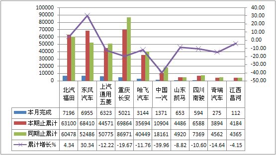 2011年8月货车生产183144辆,累计生产1783926辆,销售188100辆,累计销售1854170辆,同比累计增长分别为-4.07%和-2.36%。