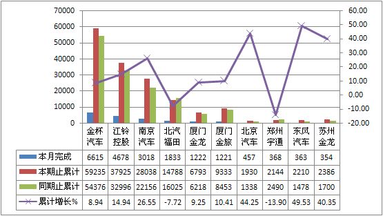 8月份中型客车的产销量分别为6756辆和6440辆,产量同比累计增长13.61%,销量同比累计增长15.66%,产量环比增长6.36%,销量环比增长8.55%