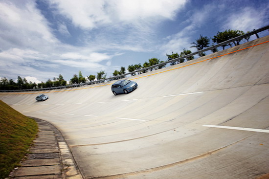 给笔者最大惊喜的是一组e6B"飞檐走壁"的照片,图片上的e6B在近乎垂直的高环跑道上飞驰如履平地,时速可想而知。据悉目前e6B正在进行24小时不间断高速环道测试,人歇车不歇,从而测试车辆的可靠性。
