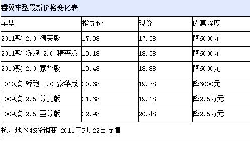 近日,编辑从杭州爱马汽车获悉,2011款睿翼有2.0 精英版、轿跑 2.0 精英版、2010款有 2.0 豪华版、轿跑 2.0 豪华版、2009款有 2.5 尊贵版和2009款 2.5 至尊版现车供应,其中2.5L优惠高达2.5万元,9月24日车展期间优惠更多,详见下表:
