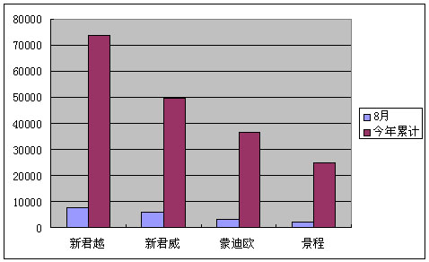 新帕萨特上市以来,表现十分抢眼,8月销售18006,今年累计销售45163辆;迈腾8月销售4984,今年累计销售47918,累计增幅-5.72%;大众CC 8月销售4201,今年累计销售25860,累计增幅312.05%;帕萨特领驭8月销售4009,今年累计销售55955,累计增幅-35.35%;昊锐8月销售3074,今年累计销售32713,累计增幅34.05%;雪铁龙C5 8月销售2517,今年累计销售22365,累计增幅-1.86%;标致508 上市第一月即销售4544辆,表现还算及格。