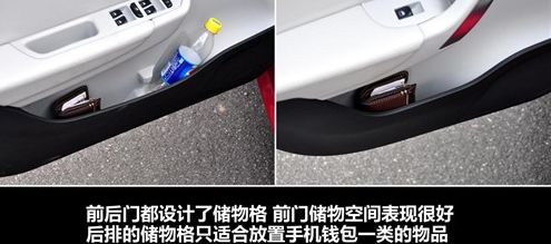 [NextPage] ● 储物空间:后排没有中央扶手和杯架,希望能改进看过了乘坐空间,我们再来看看它的储物空间,前后车门都设计了储物格,前排车门的储物格除了可以放置一般的瓶装饮料外,剩余的空间也很大。而后面只能方式钱包手机一类的物品,至于杯架似乎设计者忘记设计似的,看来坐在中华H530后排的乘客只能自己拿着水瓶了。