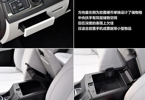 在方向盘左侧设计了专门放置硬币用的储物格,中央扶手也是双侧设计,只不过下层的储物空间深度有限,再加上上层深度的影响,下面也就只能放置一些票据或驾照类物品了。手套箱的开启不但有阻尼设计,里面的空间也很规整。