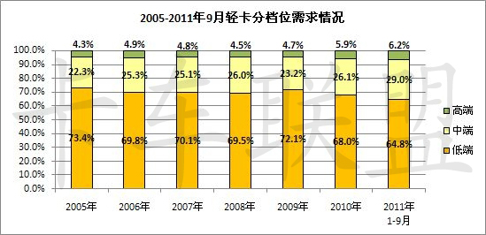 从产品结构方面上看,整个轻卡市场仍然以低档轻卡为主,中档轻卡增长趋势明显,高档轻卡市场比较稳定。前3季度,轻卡市场整体表现欠佳已是不争的事实,但位于轻卡产品谱系顶端的高端轻卡却成为市场上的最大亮点。