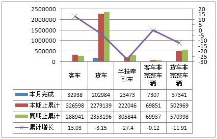2011年受国家宏观经济政策等方面的影响,商用车出现了较大幅度的降幅,产销双双出现负增长,在商用车市场领域,只有客车整车产品保持正增长,并且整张势头比较迅猛,客车累计增长达13.03%,半挂牵引车和货车非完整车辆受国家政策影响所受波及最大,累计降幅纷纷达到了两位数,分别达-27.4%、-11.91%。