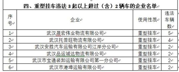 7月22日,武汉市公安交管局曝光51家安全隐患突出的货运企业,包括24家逾期未检验重点车辆达15辆以上企业,3家逾期未报废重点车辆达5辆以上企业,18家重型货车违法3起以上超过(含)15辆车的企业,6家重型挂车违法3起以上超过(含)2辆车的企业。