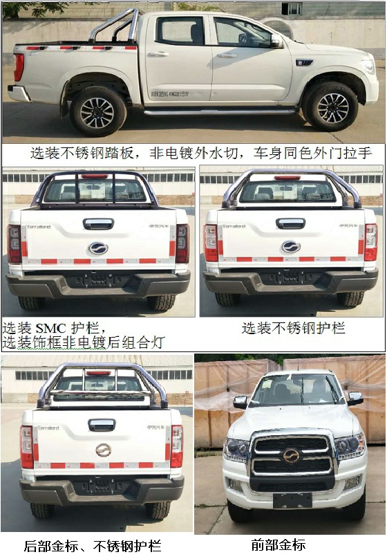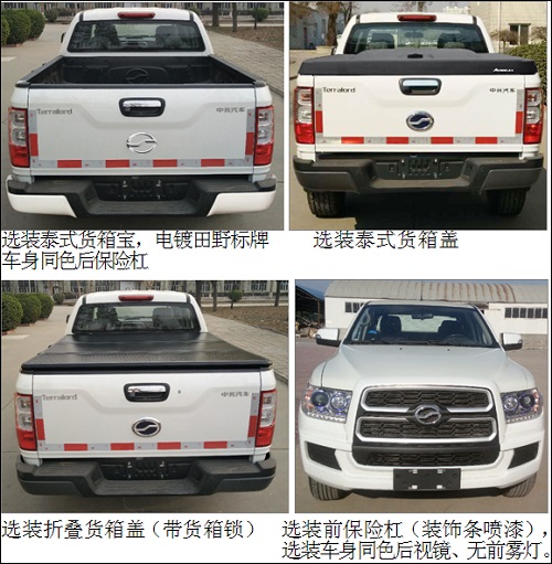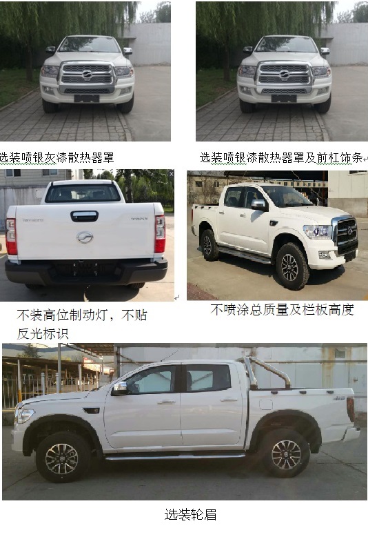 | 备注 | 选装1.胎压监测;2.真皮方向盘;3.仿皮座椅;4.GPS导航;5.不锈钢踏板;6.非电镀外水切;7.车身同色外门拉手:8. SMC护栏;9.饰框非电镀后组合灯;10. 不锈钢护栏;11. 泰式货箱宝;12.车身同色后保险杠;13.电镀田野标牌;14. 泰式货箱盖;15.折叠货箱盖(带货箱锁);16. 喷漆散热器罩,前保险杠(装饰条喷漆);17.车身同色后视镜。18.无前雾灯。19.高位制动灯、昼间行车灯为选装。20.选装银灰漆散热器罩、银漆散热器罩及前杠饰条。21.两种颜色图形商标。22.前后轮眉。选装货箱不粘贴车身反光标识和驾驶室两侧不喷涂总质量及栏板高度。高度1805为选装铝合金护栏或不装护栏时的车高,高度1820为选装SMC护栏时的车高,高度1835为选装不锈钢护栏的车高。选装泰式货厢宝时货厢尺寸为1450X1495X505。选装轮眉时车宽为1920,不装轮眉时车宽为1885。ABS系统控制器生产企业:博世汽车部件(苏州)有限公司,ABS系统控制器型号:ESP9 EV5010。发动机最大净功率为95Kw。 | ||