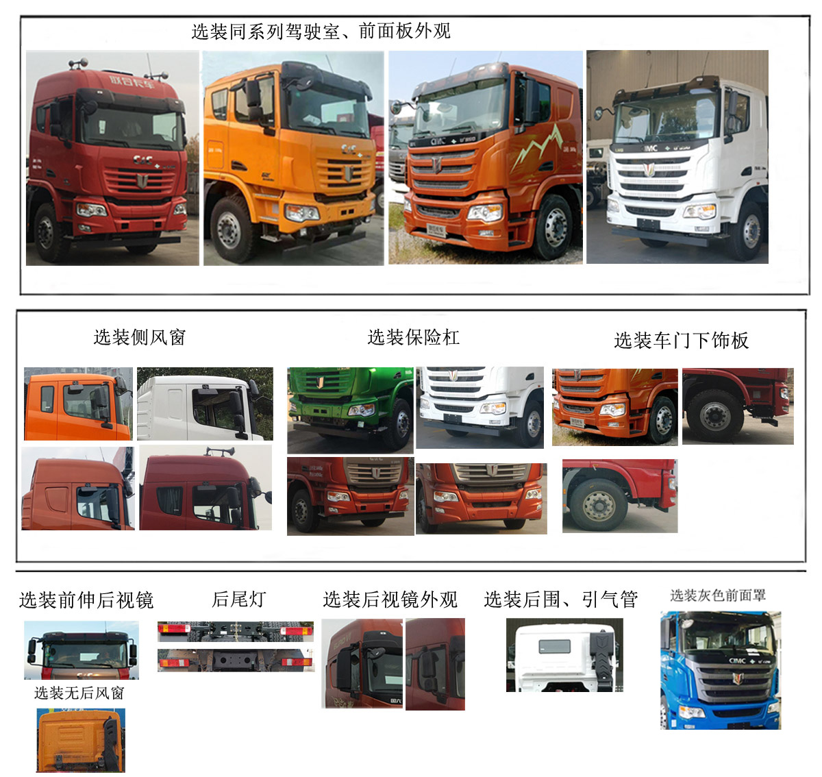 | 备注 | 随底盘选装同系列驾驶室(整车高度有3650mm和3560mm两种),前面板,侧风窗,保险杠,车门下饰板,前伸后视镜和后视镜外观,后围和引气管,无后风窗,后尾灯.选装不同结构货箱,多种环保顶盖及环保篷布盖.发动机/净功率(KW)对应关系为:YCK11400N-60/289,YCK11380N-60/275.货箱自卸方式为后卸.侧面及后下部防护装置所用材料为Q235,侧防护连接方式为螺栓连接,后防护连接方式为螺栓连接.后部防护装置的断面尺寸为120×50mm,下边缘的最大离地高度为480mm.整车长/货箱长/轴距/后悬对应关系:10555/7600/2100+3700+1350/1890,10755/7800/2100+3700+1350/2090.ABS生产厂(型号)为:浙江万安科技股份有限公司(VIE ABS-Ⅱ).安装具有卫星定位功能的行驶记录仪. | ||