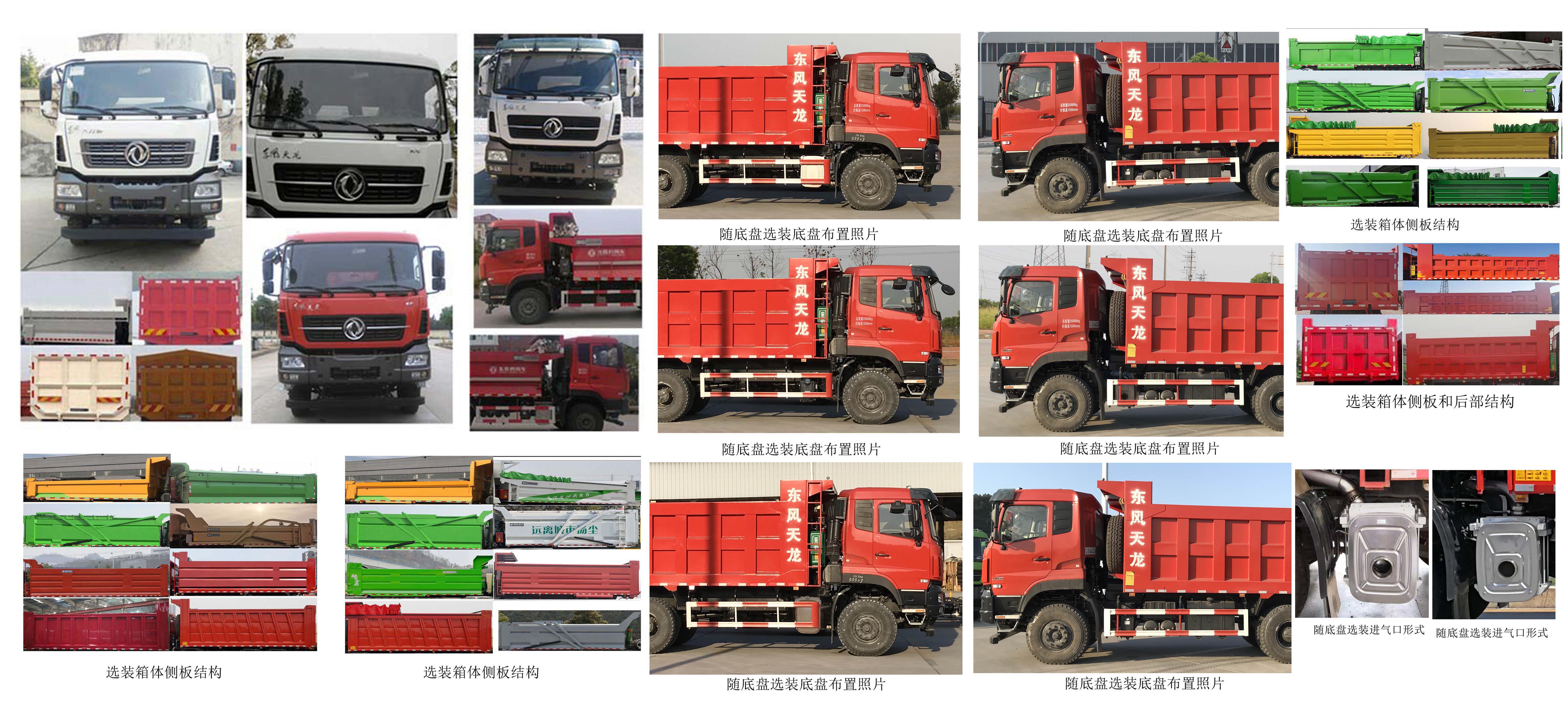 | 备注 | 1、货厢倾卸方式为后卸式。2、防护装置所用的材料材质:Q235,防护装置连接方式:螺栓连接,后部防护装置的断面尺寸(长×宽)mm:120×60,离地高度:480mm。3、随底盘选装底盘布置形式,随底盘选装进气口形式,随底盘选装保险杠及“天龙KC”标志,选装箱体侧板和后部结构,选装环保盖(环保盖可采用新材料),选装遮阳罩结构照片,选装驾驶室顶部中间不带三个装饰灯照片,选装消声器右置照片,选装油箱左置照片。4、该车应装备有具有卫星定位功能的行驶记录仪。5、ABS生产厂家:东科克诺尔商用车制动系统(十堰)有限公司;型号:3631010-C2000。6、仅选用4250+1350mm轴距。 | ||
