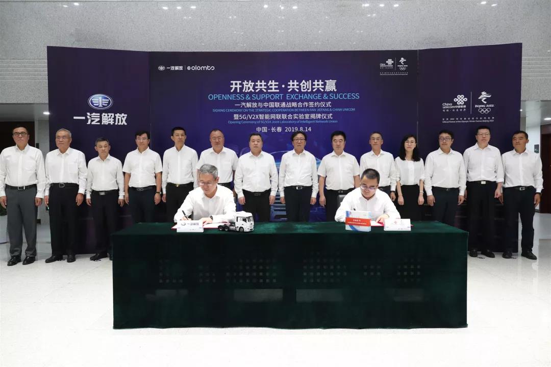 2019年8月14日,一汽解放与中国联通在长春签署战略合作协议,本次合作目的是借助双方优势,共同推动商用车智能网联化的发展。同时,一汽解放、吉林联通、联通智网还将联合开展基于车联网、自动驾驶以及工业互联网等创新业务的研究,在签约仪式当天5G /V2X联合实验室正式成立。