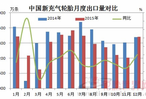 根据海关公布的最新数据,2015年12月份,中国新的充气橡胶轮胎出口4044万条,同比增长0.3%;出口额为75.93亿元,同比下降5.5%。