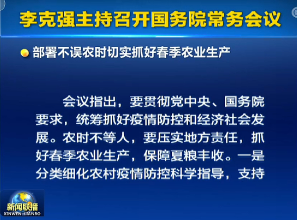 会议指出,要贯彻党中央、国务院要求,统筹抓好疫情防控和经济社会发展。农时不等人,要压实地方责任,抓好春季农业生产,保障夏粮丰收。一是分类细化农村疫情防控科学指导,支持从南到北抓紧做好春耕备耕,加强越冬作物管理。推动种子、化肥、饲料等农资企业加快复产,建立农资保供运输绿色通道。今年稻谷最低收购价保持稳定,视情可适当提高。鼓励有条件地区恢复双季稻。二是抓好畜禽生产。对重点地区损失较大的家禽养殖场户给予延长还贷期限等支持。推动屠宰企业与养殖场户对接。加快恢复生猪生产,将养殖场户贷款贴息补助范围由年出栏5000头以上调整为500头以上。增加冻猪肉国家收储。三是加强重大病虫害和动物疫病防控,强化监测和应对准备。