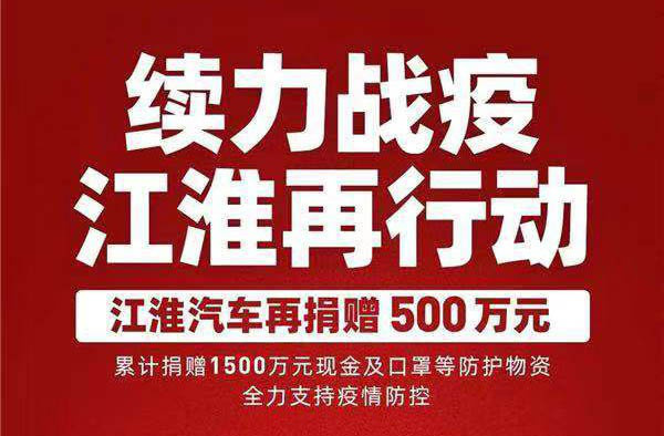 疫情爆发后,江淮汽车快速响应,先后捐款共计1500万元,支援疫情严重地区快速打响抗疫战斗。与此同时,江淮汽车也在调动全球资源采购抗疫物资,累计捐赠了5000只N95同级标准的口罩及1200套医用防护服,并协助有关单位采购紧缺医用物资50000余件,帮助疫区摆脱物资供应紧张的状况。
