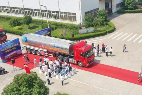 在中集瑞江1号门广场,30台搭载中集瑞江铝合金液罐的漢風430马力危化品运输车交车仪式举行,车辆在阳光的照耀下显得绚丽夺目、美观大气。在最后的交车仪式中,陈总与王总向客户交付钥匙,共同见证一辆辆徐工漢風危化品运输车向齐鲁大地进发。