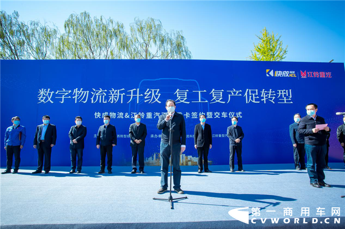 2020年4月23日,在山西转型综改示范区园区(以下简称综改区)内,江铃重汽和快成物流合作签约暨交车仪式顺利举行。随着100辆江铃威龙系列燃气重卡正式交付使用,快成物流与江铃重汽正式达成深化合作。活动现场,山西省副省长王一新、山西省政府副秘书长,山西综改示范区党工委书记张金旺,党工委副书记、管委会主任李晋平,管委会副主任赵瑞雪、艾凌宇、江铃重汽党委书记、总经理吴晓军、快成物流董事长王向前等领导出席会议。