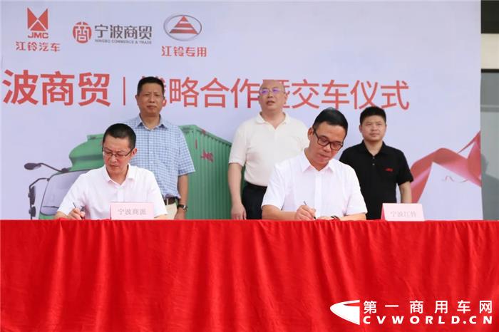 7月24日,宁波商派城配管理有限公司购置100辆江铃凯运蓝鲸展翼车型正式交车,首次交车50辆。