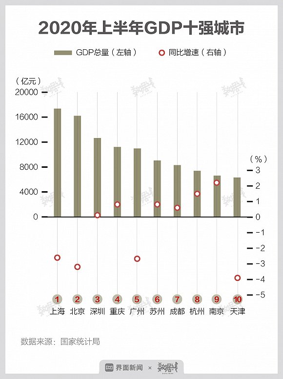 从上半年全国GDP前十强城市来看,上海、北京、深圳继续保持“三巨头”的地位,重庆超过广州,座次从上年同期的第五升至第四,疫情中心武汉尽管未公布GDP总量,但从同比-19.5%的增速来看,注定无缘前十。