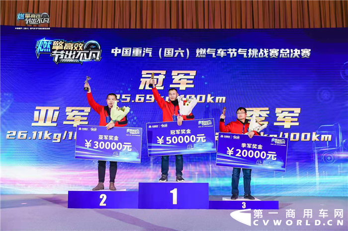 12月16日,主题为“燃擎高效 节出不凡”的2020年中国重汽(国六)燃气车节气挑战赛全国总决赛,在石家庄打响了年度总冠军争夺战,来自全国13个省份的晋级选手齐聚一堂,经过2天的激烈比拼,最终来自山东赛区的选手王汉朋以25.69kg/百公里的成绩获得总冠军,将50000元现金大奖收入囊中;江苏赛区选手刘海洋以26.11kg/百公里的成绩获得亚军,天津赛区选手陈雪峰以27.06kg/百公里的成绩获得季军。
