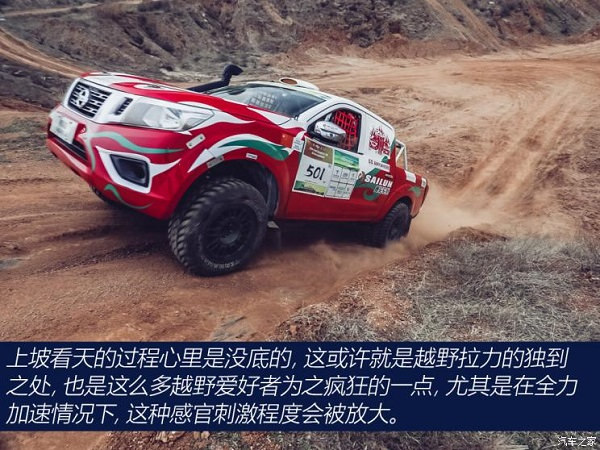 在驾驶体验开始之前,还是先来了解一下我们的主角,经过赛化升级的纳瓦拉赛车。在环塔以及丝绸之路越野拉力赛上,纳瓦拉赛车参加的都是T2量产组比赛,所以整车除了必要的安全以及底盘强化之外,赛事要求发动机以及变速箱必须是原厂状态。