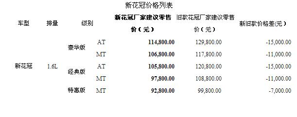 为了回馈广大消费者多年来对花冠的厚爱,一汽丰田对新花冠设定了具有强大竞争力的厂家指导价。新花冠的价格区间为9.28万元—11.48万元,比原花冠价格最高低1.5万元,令更多初次购车的消费者有机会拥有这款具有高品价比的家庭轿车。