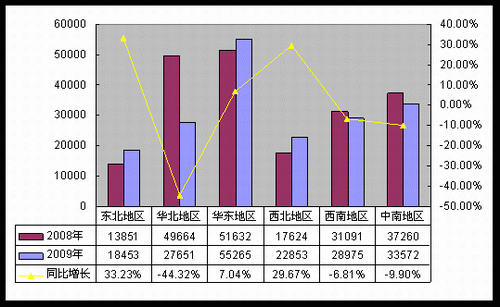 2009年1—5月份,从终端市场销售数据上来看,我国各区域共销售中重型货车186769辆,同比下降7.14%,其中华东地区销量最高,达到55265辆,是我国中重型货车销量最大的一个地区,同比增长7.04%。东北地区中重型货车销量最低,销量为18453辆,同比增长33.23%,成为上半年中重型货车销量增速最大的一个地区。华北地区同比销量降幅最大,达到44.32%,销量为27651辆。