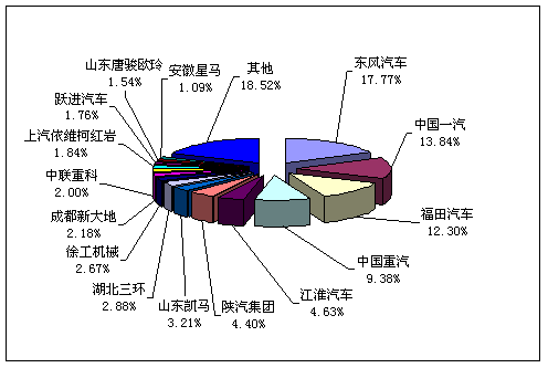 2009年1—5月我国中重卡市场仍然没有打破传统企业垄断格局,销量前十的企业分别是:东风汽车、中国一汽、福田汽车、中国重汽、江淮汽车、陕汽集团、山东凯马、湖北三环、徐工机械、成都新大地;其中东风汽车占据17.77%的市场份额,中国一汽占据13.84%的市场份额,福田汽车占据12.30%的市场份额。中国重汽占据9.38%的市场份额。前15家企业共占据了81.48%的市场份额。