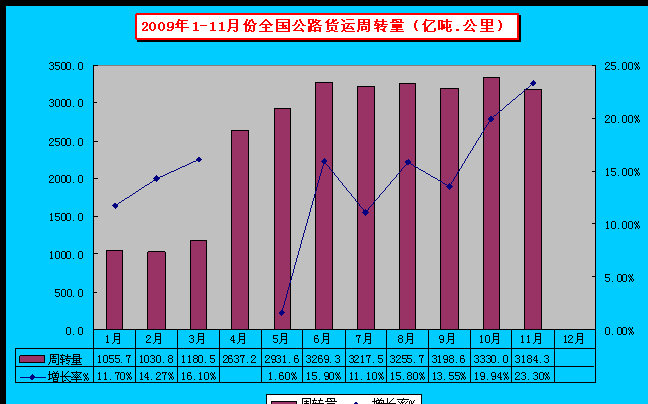公路货运占据着中国货运市场的主导位置,2009年1-11月份,公路货运总量190.99亿吨,同比增长8.6%,占据国内货运总量249.67 亿吨的76.5%。根据2009年货运总量走势来看,6月份以后,随着国内经济的稳步恢复发展,公路运量平均在18亿吨以上。尤其是8月份以后,公路运量再上台阶,环比增长在5%以上。