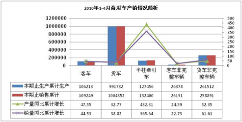 1-4月份,商用车累计产销为151.33万辆和153.11万辆,比去年同期累计增长46.12%和51.74%。