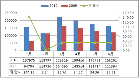 受汽车下乡政策逐步深入、以旧换新的补贴标准的提高等因素的影响,2010年上半年轻卡市场继续延续放量增长,共销售1036264辆,同比增长38.97%。各月情况如下: