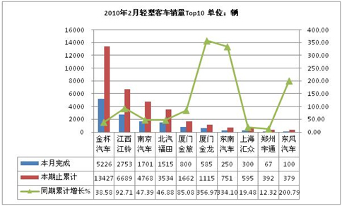 2010年2月客车生产16743辆,累计生产45320 辆,销售18674辆,累计销售50193 辆,同比增长分别为64.2%和62.68%。