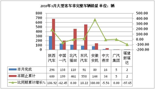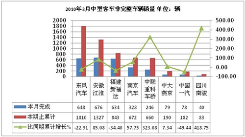 2010年3月客车非完整车辆生产7804辆,累计生产17686辆,销售7237辆,累计销售9800辆,同比累计增长分别为20.81%和17.17%。