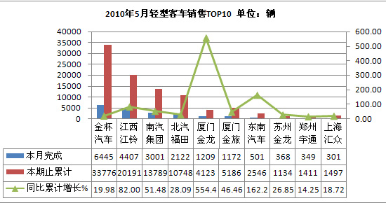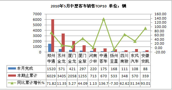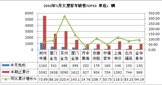 2010年5月客车生产30351辆,累计生产136612辆,销售29296辆,累计销售138572辆,同比累计增长分别为46.94%和44.34%。