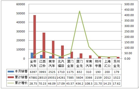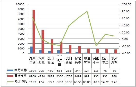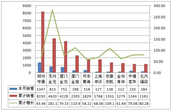 2010年7月客车生产26218辆,累计生产191648辆,销售27432辆,累计销售197364辆,同比累计增长分别为37.64%和40.59%。