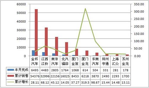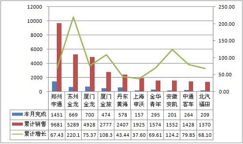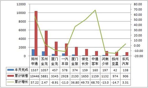 2010年8月客车生产30203辆,累计生产221853辆,销售30118辆,累计销售227482辆,同比累计增长分别为35.64%和37.98%。