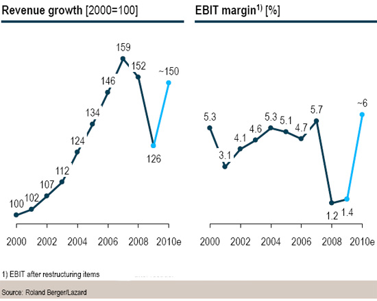 全球供应商的EBIT利润率(息税前利润率)在2008和2009年降至十年来的低点,分别为1.2%和1.4%,而欧洲的供应商的EBIT利润率在2009年更降至-1.1%。(参见图1)