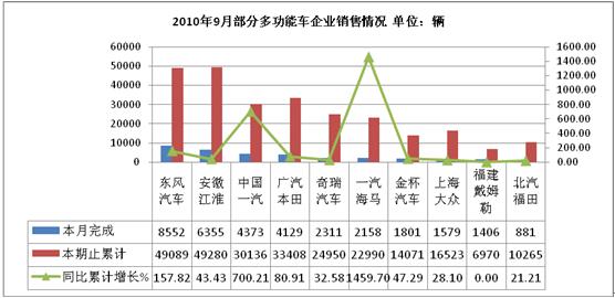 2010年9月多功能车生产42086辆,累计生产319383辆,销售40335辆,累计销售314478辆,同比累计增长分别为92.22%和88.62%。