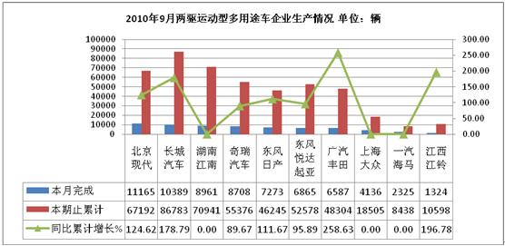 2010年9月两驱运动型多用途车生产74108辆,累计生产532836辆,销售70692辆,累计销售526388辆,同比累计增长分别为160.35%和157.64%。