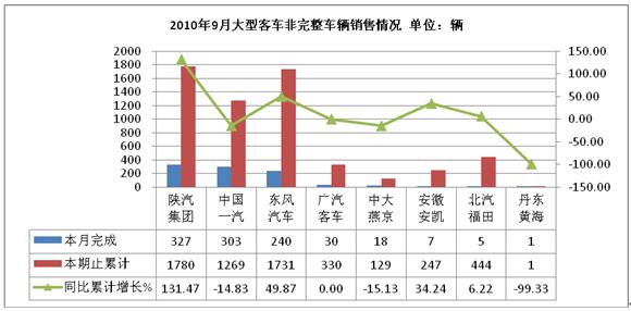 2010年9月客车非完整车辆生产7324辆,累计生产62847辆,销售7278辆,累计销62243辆,同比累计增长分别为7.06%和6.29%。
