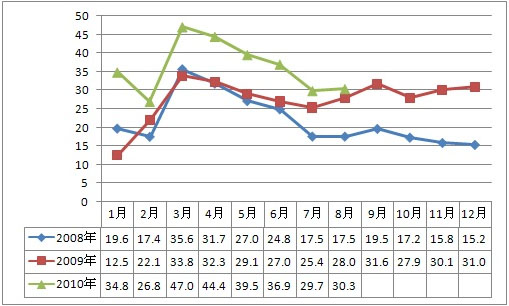 2008年-2010年商用车分月销量情况(单位:台)