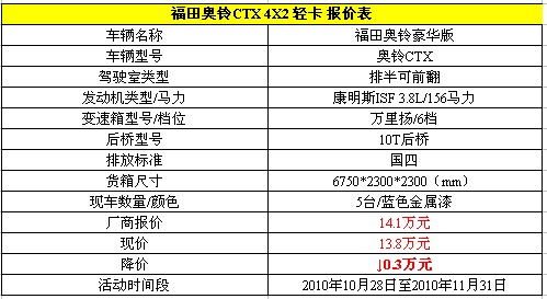福田奥铃CTX轻卡自上市一来一直广受关注,2010福田奥铃CTX中国勒芒轻卡耐力赛的举办更是把奥铃CTX的热度推向高潮。今天小编得到了无锡市润达汽车贸易有限公司的一条关于奥铃CTX的降价促销的信息,下面我们一起来看看吧。