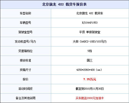 北京旗龙是北汽公司新推出的一款高端轻卡,旗龙的推出意味着北汽公司形成了旗龙与旗铃高低两个产品。而这次参加“买车送加油卡活动”的这台旗龙4X2载货车,采用了技术成熟的大柴CA4DC2-10E3103马力发动机,满足国三排放标准要求,搭载了5挡变速箱。货箱尺寸为4250*2060*400